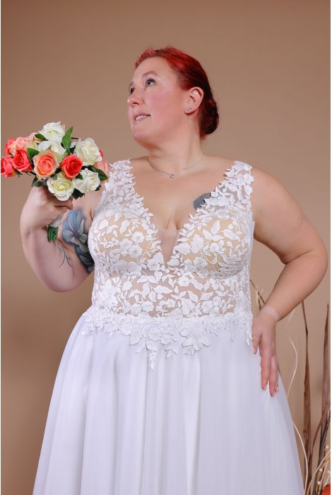 Dieses extravagante Brautkleid (für große Größen) aus unserer XXL-Kollektion ist die perfekte Wahl für alle zukünftigen Bräute, die einen dramatischen und dennoch romantischen Brautlook für ihren großen Tag suchen.